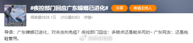 针对此次网友们对蟑螂“进化”的担忧,佛山疾控中心迅速出来澄清。10月15日,据多家媒体报道,佛山疾控一工作人员表示,“蟑螂已进化”的猜测不科学,此次实验中采用的是单一成分的杀虫剂,而市面上常见的杀虫剂大多是复配型,一般成分较为复杂。此外,本次抗药性实验使用的杀虫剂种类较少,其他成分的杀虫剂如残杀威、吡虫啉都未进行实验,无法直接定论其对消灭蟑螂是否有效。另外,低度抗性是指蟑螂对杀虫剂有抵抗力,但不太强,使用时可适当加大剂量。