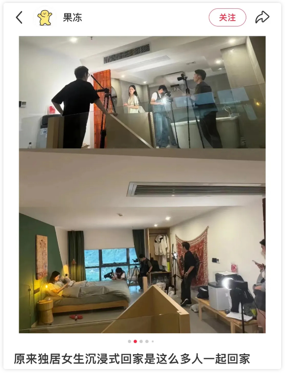 实际上,不光是农村生活能造假,山区孤儿、精致独居女生、大厂精英高管也全都可以按剧本走。博主和MCN包装、演戏的工业流水线,不断升级、防不胜防。在上海短视频中心,不同贫富档次对标的家、大学生宿舍、医院病房、教室应有尽有。一个拍摄场能满足多个工种博主的需求,自媒体也有自己的横店。甚至地铁、小面馆也有,在短视频里出现很难分清是不是真实场景。