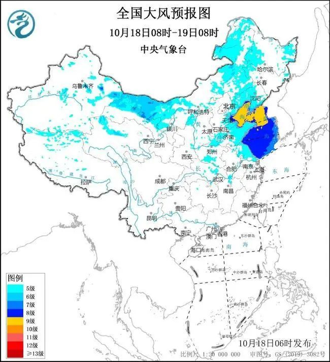 预计,10月18日08时至19日08时,内蒙古大部、黑龙江西部、辽宁大部、新疆东部、甘肃河西、河北东北部、天津大部、山东大部、江苏北部等地有5~6级、阵风7~8级的大风,其中内蒙古西部和东部、辽宁南部、山东半岛等地的部分地区阵风可达8~9级;渤海、渤海海峡、黄海大部海域将有7~8级、阵风9~10级的大风,其中渤海、渤海海峡、黄海北部和中部海域的风力可达9级、阵风10~11级。