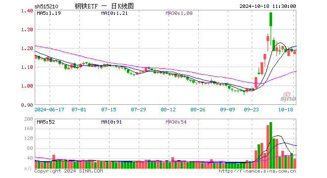 10月18日,截止午间收盘,钢铁ETF(515210)跌0.08%,报1.179元,成交额4437.12万元。钢铁ETF(515210)重仓股方面,宝钢股份截止午盘跌1.07%,包钢股份涨0.63%,华菱钢铁跌1.86%,久立特材涨3.27%,中信特钢跌1.62%,南钢股份跌0.87%,抚顺特钢涨7.92%,新兴铸管跌1.30%,河钢股份跌0.47%,河钢资源跌0.67%。