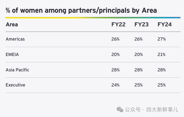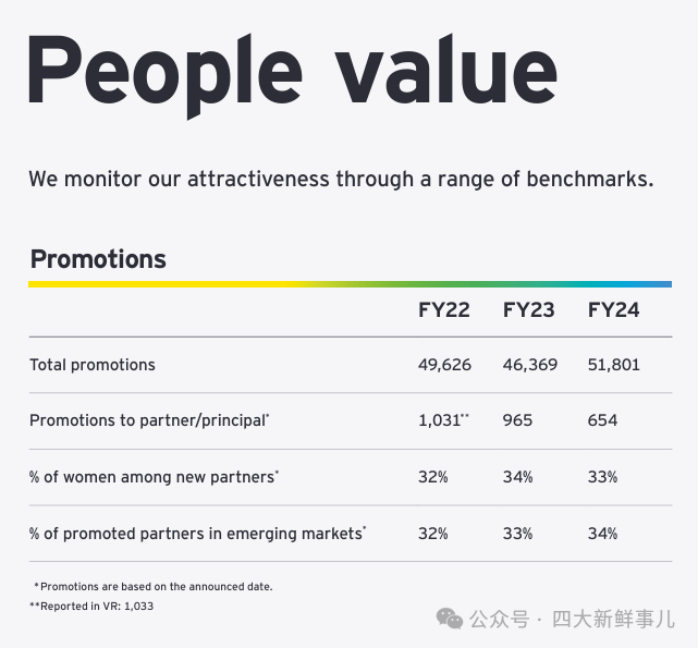 在24财年,合伙人晋升中,33%为女性。总体而言,今年共有654人晋升为合伙人/主管