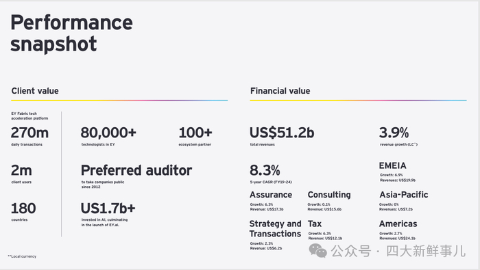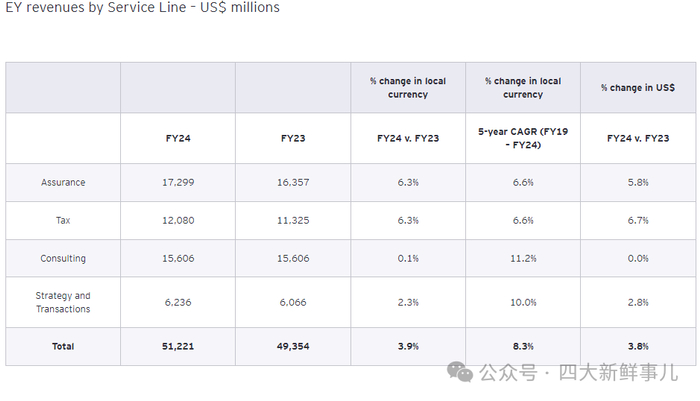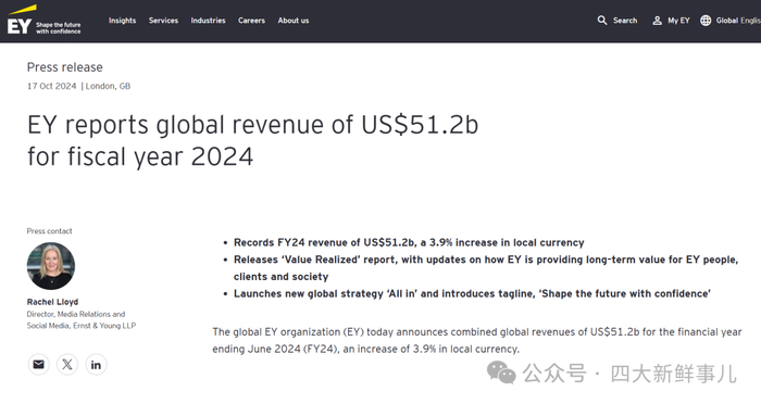 2024年10月17日,安永全球官网公布安永2024财年业绩。在截至2024年6月的财政年度(FY24),安永的全球合并收入为512亿美元,以当地货币计算增长3.9%。