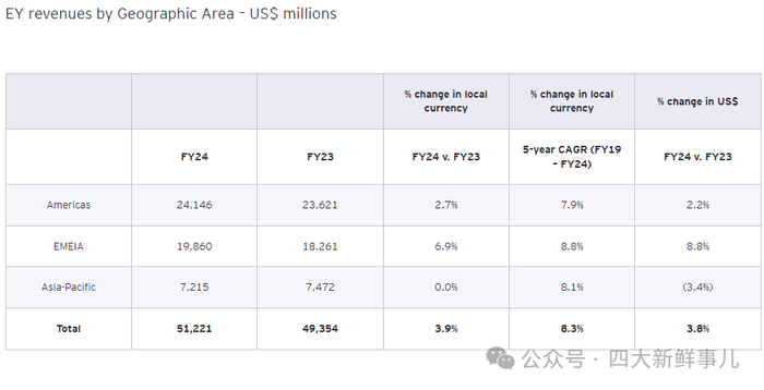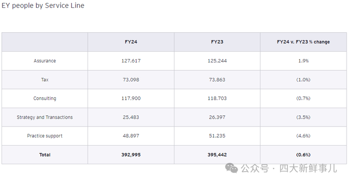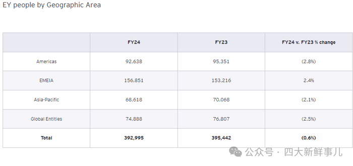 2024财年,安永在全球拥392,995名员工,较2023财年的395,442名员工减少了0.6%。