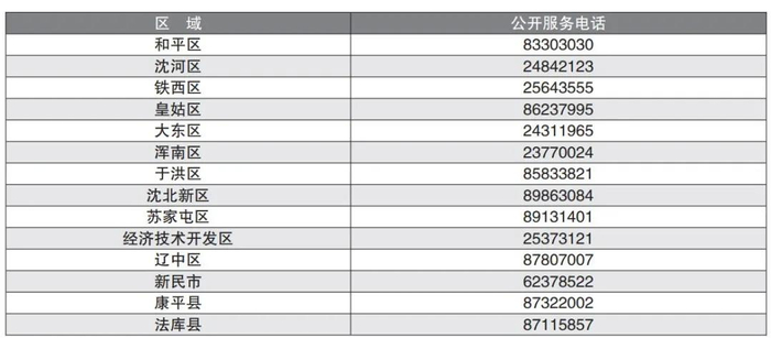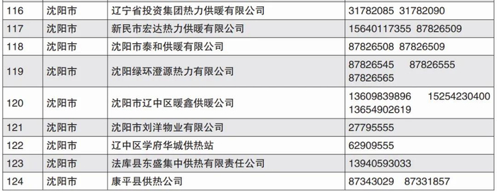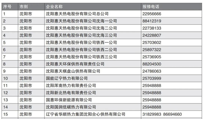 沈阳部分供热投诉及维修电话表