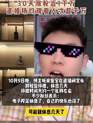 10月9日晚,“听泉鉴宝”在直播间宣布将短暂停播休息几天。