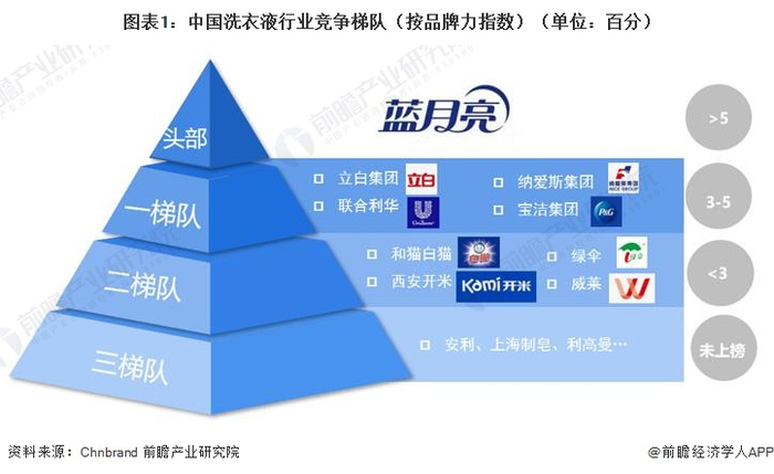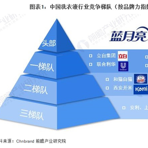 根据Chnbrand公布的2024中国品牌影响力指数得分,我国将洗衣液用品企业分为三个梯队,其中蓝月亮遥遥领先其他所有品牌,可见在国内将洗衣液与蓝月亮联系在一起的观念深入人心。第一梯队包括立白、纳爱斯、联合利华,这些企业旗下都有2个及以上品牌上榜,可见在中国洗衣液市场的占有率也较高;第二梯队的企业包括威莱集团、上海和黄白猫、西安开米等,这些企业销售区域特征明显,未能在全国范围形成较强的竞争力;居于第三梯队的众多洗涤用品知名度和销售范围则更小,市场占有率较低。