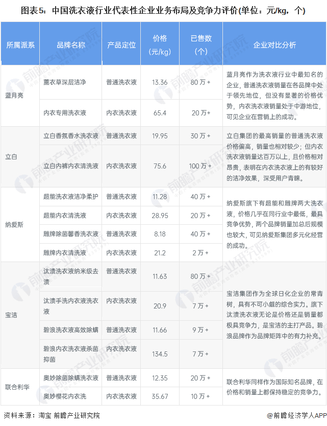在洗衣液产品布局方面,目前国内市场的洗衣液品牌主要以蓝月亮、立白和纳爱斯为主的中国企业,和宝洁、联合利华的国际企业,截至2024年7月25日,通过淘宝官方旗舰店销量最高产品的价格和已售数量,分析这些企业在国内洗衣液市场中的竞争力。