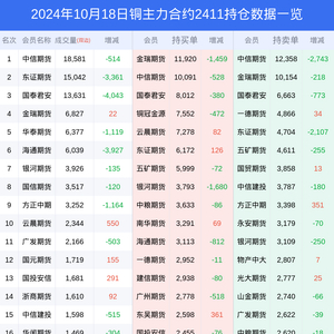 新浪期货 根据交易所数据,截至10月18日收盘主力合约2411,涨跌+0.34%,成交量6.84万手,持仓数据显示前20席位呈现净多,差额头寸为8755手。