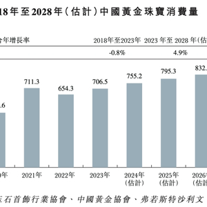 实际上,我国黄金珠宝消费量波动较大,2023年的消费量为706.5吨,不及2018年的736.3吨,中间多个年份的销量都处同比下滑趋势。2018年—2023年的年复合增长率为-0.8%,常年的波动也让2023年—2028年的4.9%年复合增长率预期显得过于乐观。