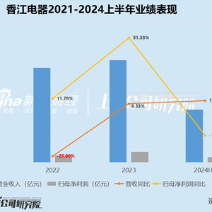 同期,香江电器的归母净利润分别为0.72亿元、0.80亿元、1.21亿元、0.61亿元,2022年以来同比增长率分别为11.78%、51.33%、-12.43%,盈利规模在2024上半年出现减少。