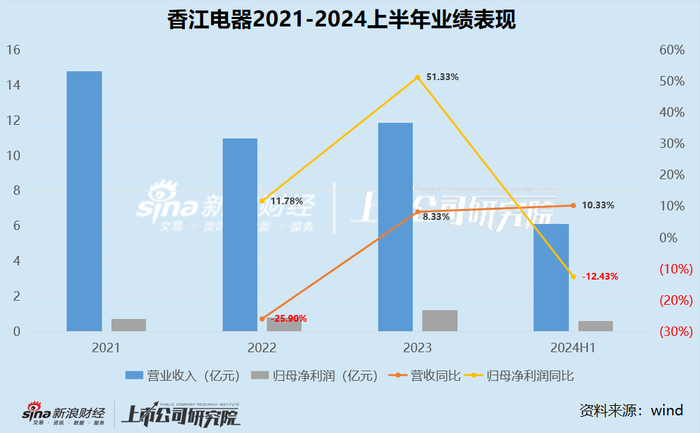2021-2024上半年,香江电器实现营业收入分别为14.80亿元、11.00亿元、11.92亿元、6.17亿元,其中2022年同比下滑25.82%,而2024上半年的收入规模也基本与近两年全年规模的一半相持平,换句话说,香江电器在冲刺上市的近几年中,收入规模难增长,甚至还有所缩水。