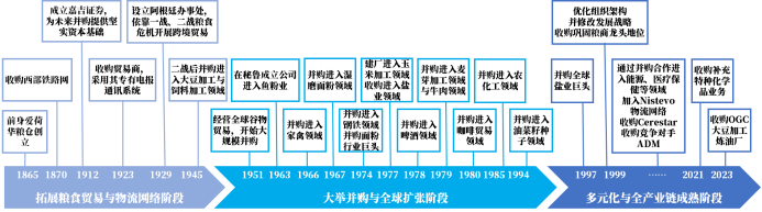 依靠收并购,嘉吉形成了“资本+物流运输网络+谷物产业链+肉类产业链+工业产业链+其他业务”的多元化战略版图。上述并购历程可大致分为三个阶段: