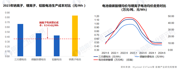 尽管钠离子电池的原材料成本相对较低,但目前钠离子电池理论成本优势尚未体现出来,出货量及产业化发展不及预期。当电池级碳酸锂价格在20元/Wh以下时,钠离子电池目前的平均生产成本仍在三元锂离子电池、磷酸铁锂电池和铅酸电池等竞品之上。