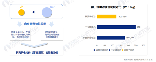 钠离子的离子半径比锂离子大,且钠的相对质量比锂大,导致钠离子电池在能量密度上存在天然劣势。意味着在相同体积或重量的情况下,钠电池储存的能量要比锂电池少。对动力领域而言,直接关系到电动车的续航里程;对于储能领域而言,则关系到系统单位体积内的储能容量和效率。