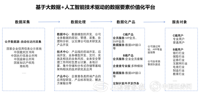 公开资料显示,企查查的商业模式建立在大数据与人工智能技术之上,旨在通过提供一站式商业大数据服务来创造价值。其业务流程可以概括为四个核心环节:数据收集、数据处理、数据产品开发以及服务对象的确定。
