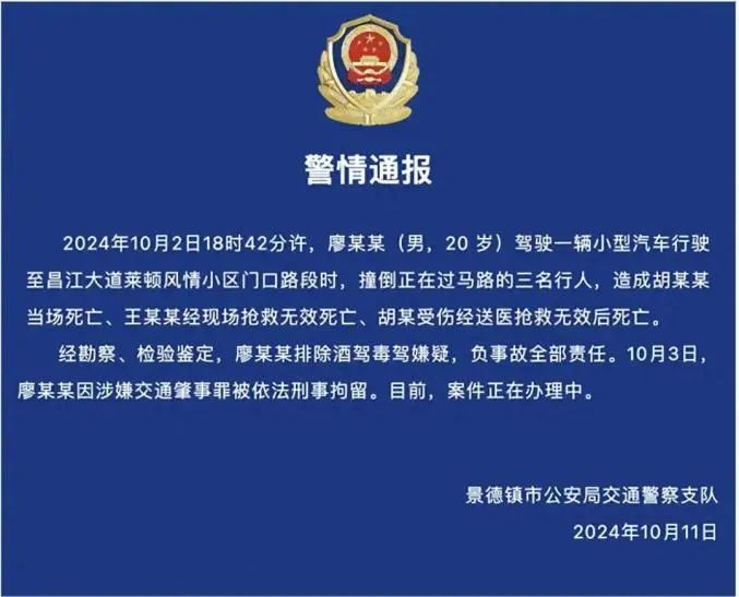 一起发生在江西景德镇的车祸引起持续多日的关注。10月11日,景德镇交警部门通报称,事故发生于10月2日18时42分,20岁的廖某某驾车通过某小区附近,3名过马路行人被撞,1人当场死亡、1人现场抢救无效死亡、1人送医抢救无效死亡。肇事者廖某某排除酒驾毒驾嫌疑,次日因交通肇事罪被刑事拘留。