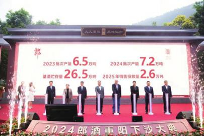 活动现场,郎酒股份常务副总经理、销售公司总经理兼青花郎事业部总经理梅刚代表公司宣布:“截至 2024 年重阳节前,2023批次酱香郎酒已生产完毕,郎酒酱香基酒实际贮存量已达26.5 万吨。从今天 2024 批次酱香郎酒重阳下沙生产开始,郎酒酱酒产能已达 7.2 万吨。2025年,酱香郎酒销售投放计划不超过2.6万吨。”