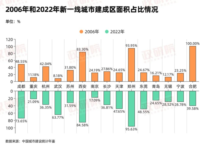 2006年,成都的建成区面积占比为48.55%,在15个新一线城市中排名第四;2022年,成都建成区面积占比扩大到73.65%,排名上升一位至第三位,仅次于郑州和西安。可见,这将近20年的时间里,成都的发展可谓天翻地覆。