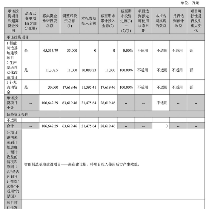 作为核心募投项目的“智能制造基地建设项目”,募集资金承诺投资总额为65333.79万元,调整后投资总额为35000万元。