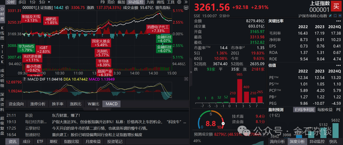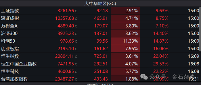在一搏概念推动之下,午后A股全面爆发,沪指一度涨超4%,最终收涨不足3%,科创50暴涨11%,创业板指一度逼近10%收涨近8%。此外,港股也全面开花。
