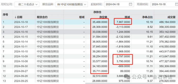 以中证1000股指为例,2024年10月18日空单数据陡增,最近一周基本空单都在减少,增加也是1000多手,10月18日突然暴增7867手,远远超过了9月底、10月9号前后的空单数据。而净空单数35468手,基本和9月30日空单数据相当。