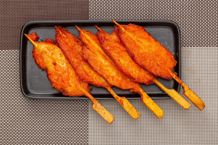 校门口一条一条的炸鸡柳,确实让人有点猜不出它来自鸡身上哪个部位。那么,像下面这种鸡柳串,就比较好窥出端倪了——鸡柳来自鸡胸肉。