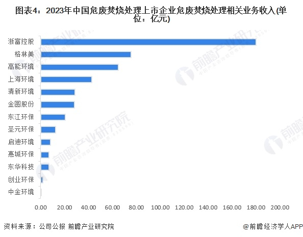 按危废焚烧处理相关业务收入来看,2023年,浙富控股以180.01亿元的业务收入位列第一;格林美业务收入约75.60亿元。