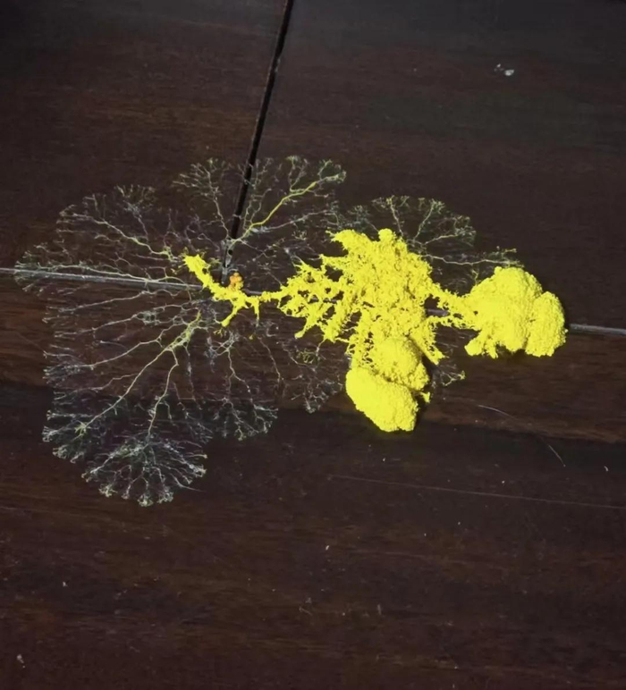黏菌会移动,在环境中快速繁殖,还能被颜料染色,展现出比较独特的花纹形状。