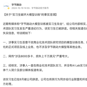 对此,19日下午,字节跳动发布《关于“实习生破坏大模型训练”的事实澄清》,称涉事实习生恶意干扰商业化技术团队研究项目的模型训练任务,但并不影响商业化的正式项目及线上业务,也不涉及字节跳动大模型等其他业务。网传“涉及8000多卡、损失上千万美元”严重夸大。