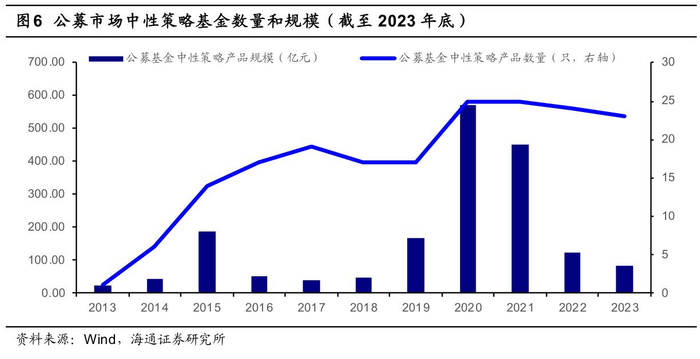 目前公募基金市场上存续的市场中性策略产品共23 只,合计规模约83亿元,在权益类产品中的占比相对较低。且 2021 年开始,市场上并未有新的市场中性策略公募产品发行。