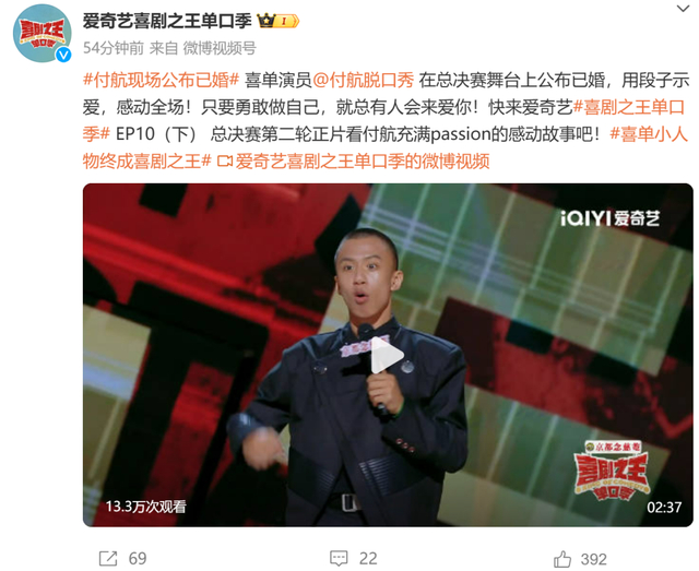 《喜剧之王单口季》官方账号评价付航:他是passion拉满的“美猴王”,是敢喝“火”更敢用幽默勇对生活一切苦难的勇者。从小人物到喜剧之王,他有热爱、有勇气、有真心!