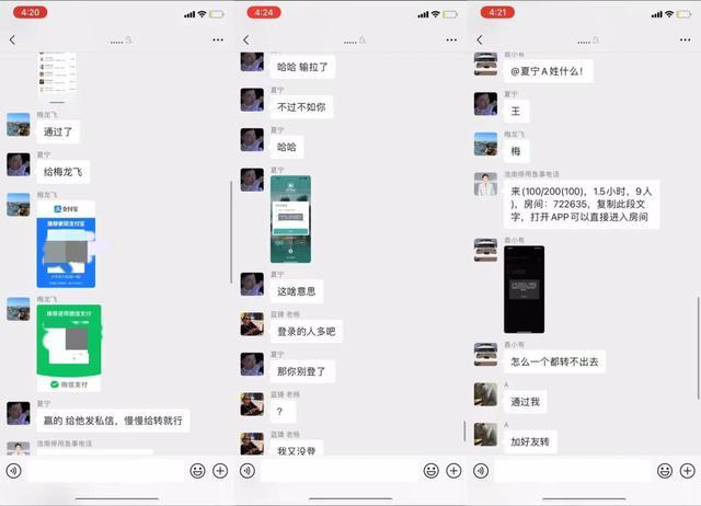 记者发现,主播们是用一款名为WePoker的软件进行赌博,组织者在app内开好房间,然后将房间链接发布到微信群里吸引参与者进入。聊天群内夏宁、浩南等主播不断呼吁群友进房间开赌。