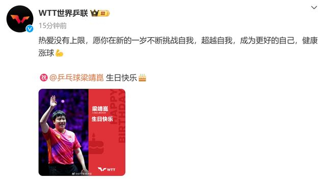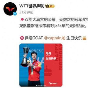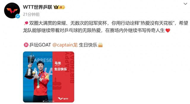 今天早晨,@WTT世界乒联 发文为马龙庆生:双圈大满贯的荣耀、无数次的冠军奖杯,你用行动诠释“热爱没有天花板”,希望龙队能够继续带着对乒乓球的无限热爱,在赛场内外继续书写传奇人生。