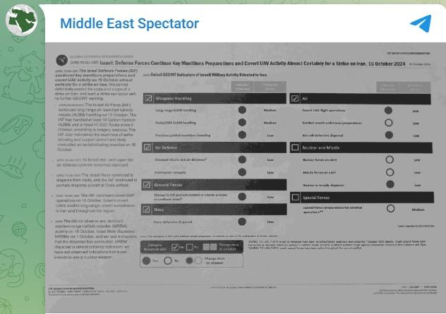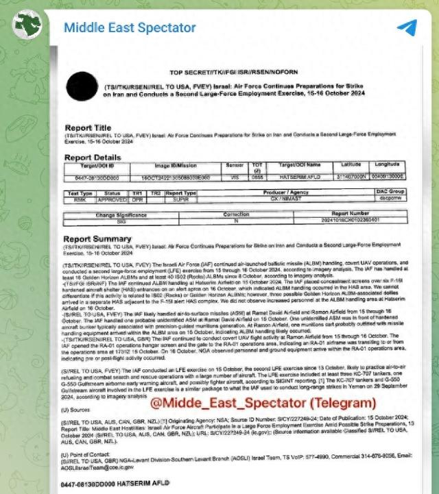 一个名为“中东观察家”(Middle East Spectator)的Telegram账户10月18日发布了两份日期分别为10月15日和16日的文件,文件被标记为“绝密”(top secret)类别,并显示只能由美国及其“五眼联盟”盟友澳大利亚、加拿大、新西兰和英国查看。