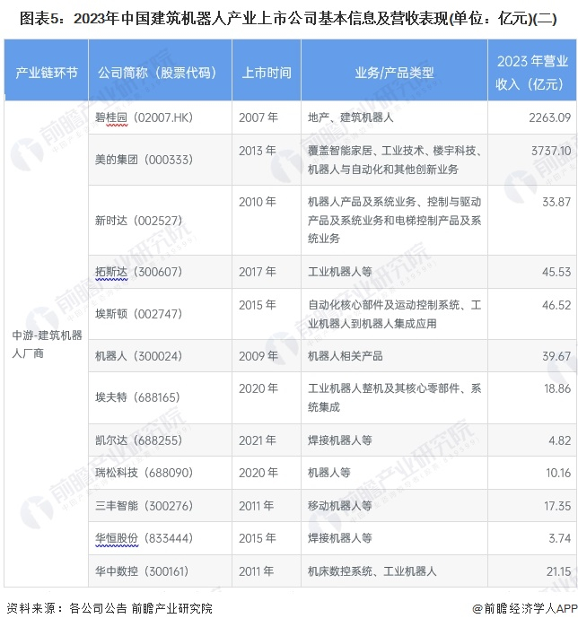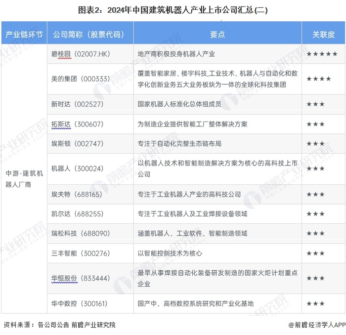 行业主要上市公司:碧桂园(02007);埃斯顿(002747);新时达(002527)等