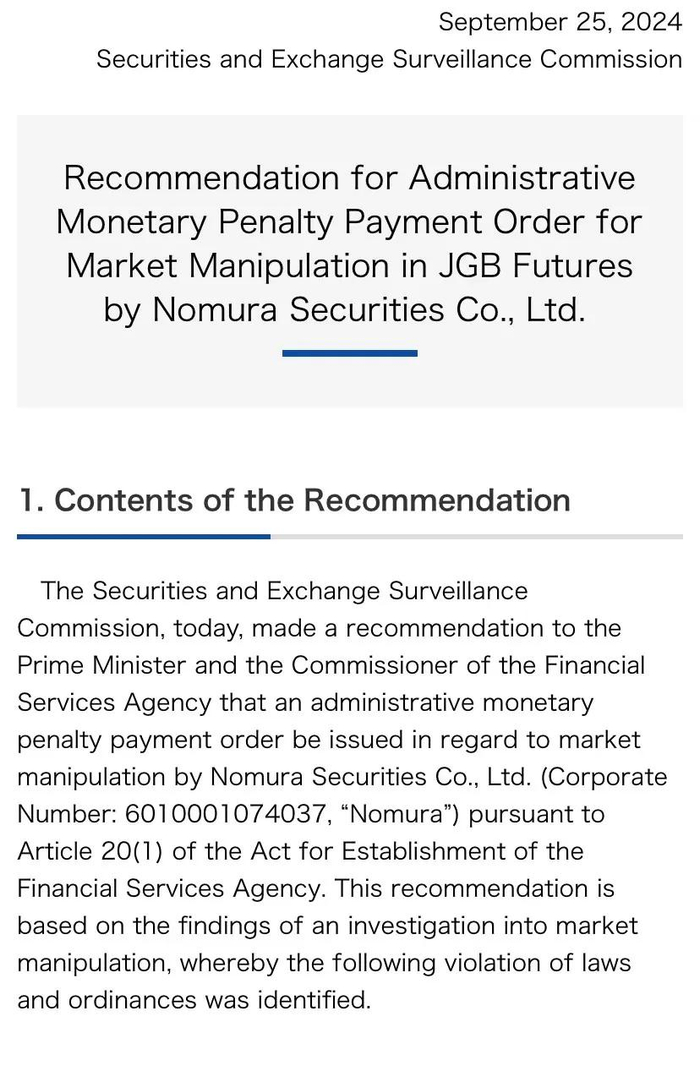 此前,9月25日,日本证券交易监督委员会(Securities and Exchange Surveillance Commission,以下简称“SESC”)公告称,对野村证券的日本国债期货市场操纵行为提出处以行政罚款的建议,总额2176万日元。该建议是基于对市场操纵调查结果的发现。