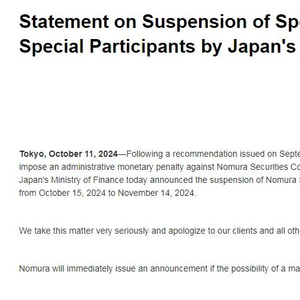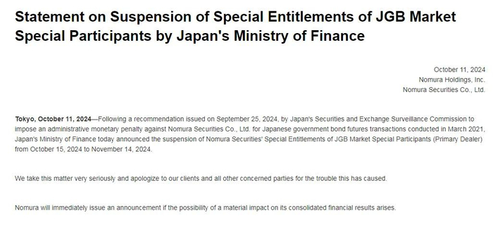 当地时间10月11日,野村控股公告称,日本财务省宣布将暂停野村证券自2024年10月15日至2024年11月14日期间的国债市场特别参与者资格。该事项涉及公司于2021年3月进行的国债期货交易行为。