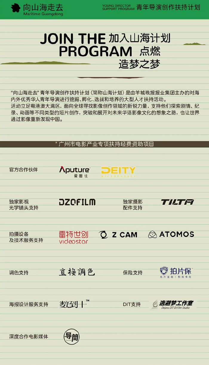 山海计划是由羊城晚报报业集团主办的对海内外优秀华人青年导演进行挖掘、孵化、选拔和培养的大型人才扶持活动。活动立足于粤港澳大湾区,面向全球寻找影像创作领域的新锐力量,支持他们探索剧情、纪录、动画等不同类型的短片创作,突破和展开对未来华语影像文化的想象之路,也让世界通过影像重新发现中国。