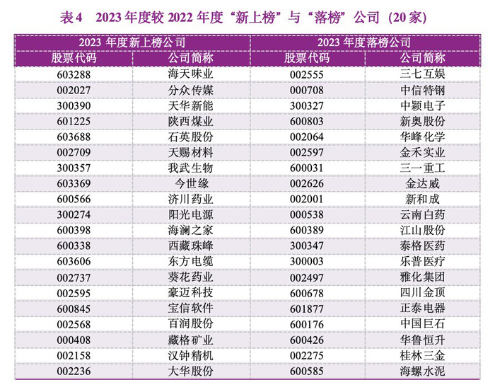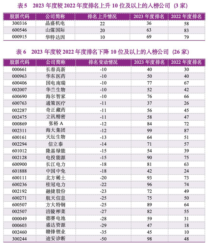 较之2022年度,2023年度“新上榜”的公司主要由如下原因所致:①2022年度未满足标准2,但2023年度已满足,即公司自第一年统计口径开始恰好满10年,主要有海天味业、天华新能、陕西煤业、石英股份、天赐材料、我武生物、今世缘、东方电缆、葵花药业;②2022年度存在会计违规事项,但2023年满足所有标准,有藏格药业;③2022年度未满足标准4,但2023年已满足,即截至榜单编制,公司税后营业利润的近三年累计值和FCF3的近三年累计值均大于零,有阳光电源、豪迈科技;④其余公司均因名次相对上升进榜。