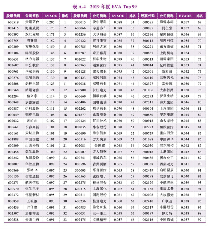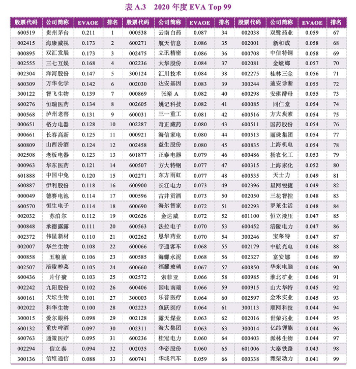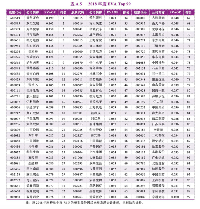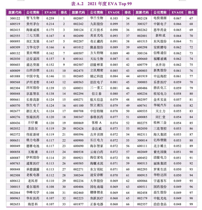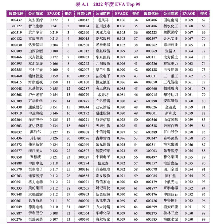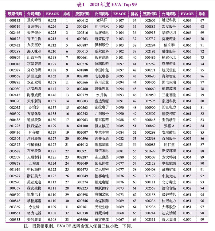 在经过上述4个标准筛选出的上市公司样本中,研究团队采用经济增加值创造力指标——净资产经济增加值回报率(EVAOE)来进行排序,最终确定榜单各个年份的EVA Top 99名单。