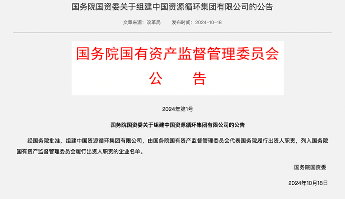 18日下午,国务院国资委发布关于组建中国资源循环集团有限公司的公告:经国务院批准,组建中国资源循环集团有限公司,由国务院国有资产监督管理委员会代表国务院履行出资人职责,列入国务院国有资产监督管理委员会履行出资人职责的企业名单。资环集团成为国务院国资委履行出资人职责的新一家央企,在98家央企名录中位列66位。