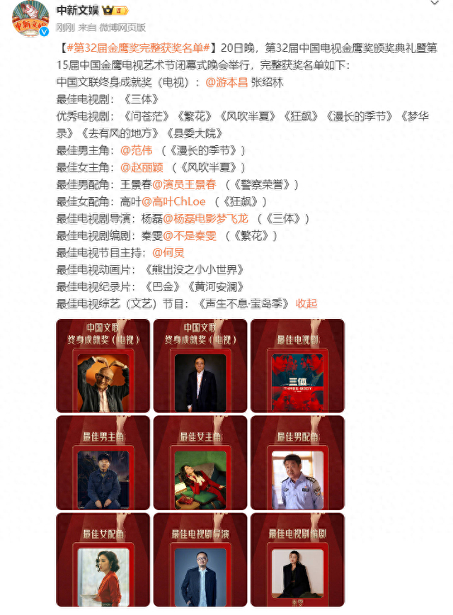 第32届中国电视金鹰奖,完整获奖名单来了!