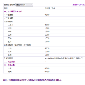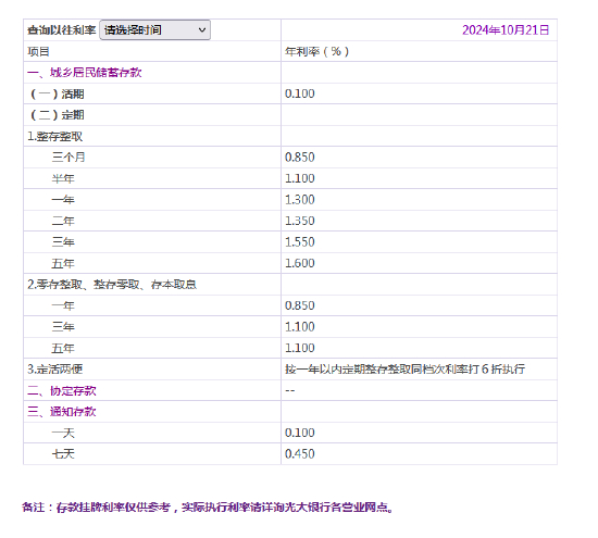 10月21日金融一线消息,光大银行调整人民币存款挂牌利率,本次调整自2024年10月21日起,活期存款利率下调至0.1%,定期三个月期、半年期、一年期、三年期和五年期分别为0.85%、1.1%、1.3%、1.50%和1.55%。