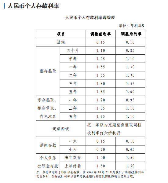 10月21日金融一线消息,民生银行调整人民币存款挂牌利率,本次调整自2024年10月21日起,活期存款利率下调至0.1%,定期三个月期、半年期、一年期、三年期和五年期分别为0.85%、1.1%、1.3%、1.50%和1.55%。