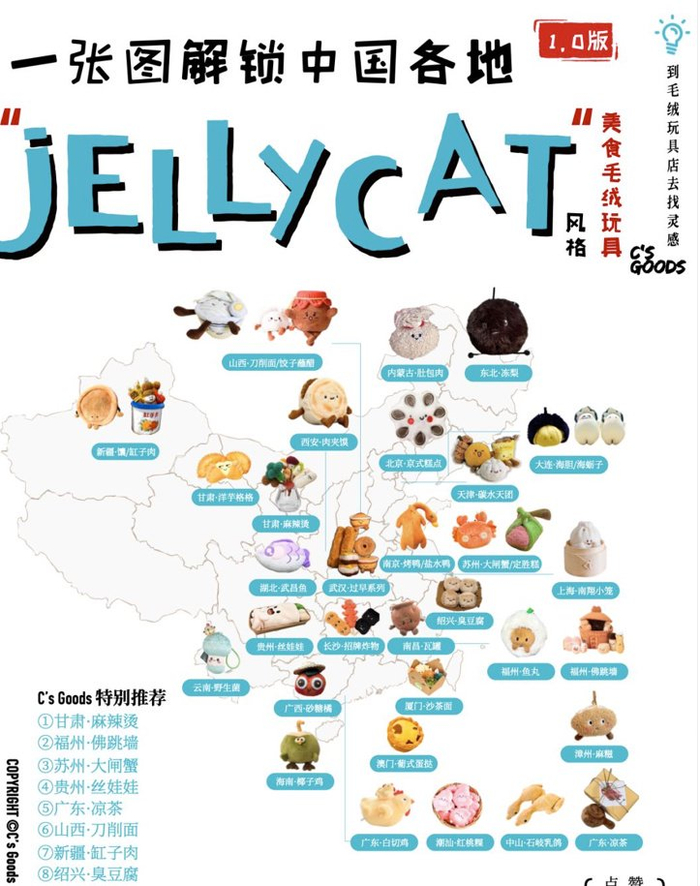 不少社交平台的博主,还做了解锁中国各地“jellycat”的攻略地图,不少帖子的点赞量都在万级以上。可以说,从产品类别、销量还有社交平台的热度,过家家的风确实吹到了文创。