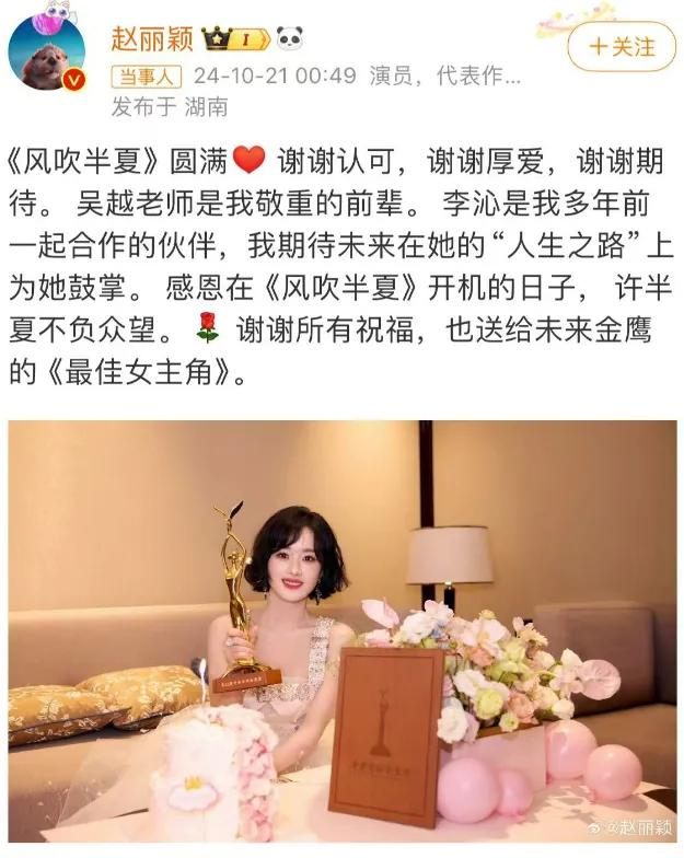 在此之前,赵丽颖曾于2016、2020年分别凭借《花千骨》和《知否知否应是绿肥红瘦》两次获得金鹰奖“观众喜爱的女演员”奖。