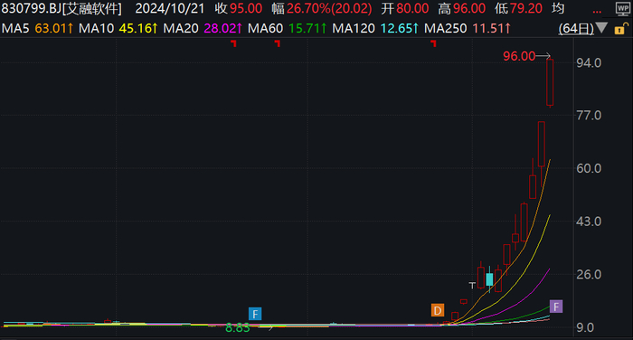9月24日以来,北证50指数累计涨幅达100%,远超上证指数的19.6%和创业板指的46.4%。10月21日周一,该指数大涨超13%,其中作为北交所的华为鸿蒙概念股龙头艾融软件涨幅超十倍,股价从9.22元上涨至95元,成为本轮牛市中首个十倍股。