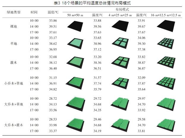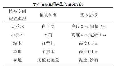 通过软件构建了18个理想绿地场景,3种不同碎片化程度的植被空间配置类型和6种植被类型,如表1所示。