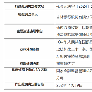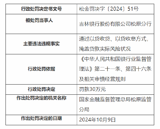 10月21日金融一线消息,国家金融监督管理总局松原监管分局行政处罚信息公开表显示,吉林银行股份有限公司松原分行因通过以贷收贷、以贷收息方式,掩盖贷款实际风险状况,被国家金融监督管理总局松原监管分局罚款30万元;