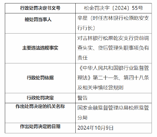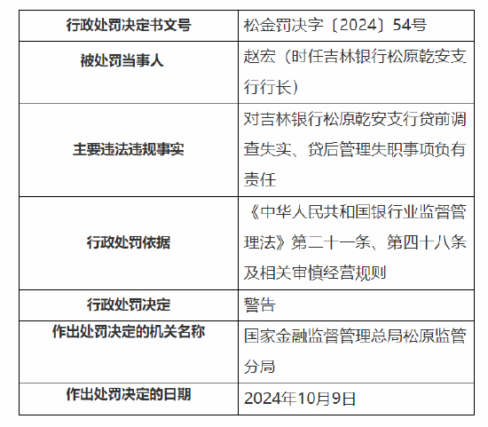 此外,吉林银行股份有限公司松原乾安支行因贷前调查失实,贷后管理失职,被国家金融监督管理总局松原监管分局罚款30万元;